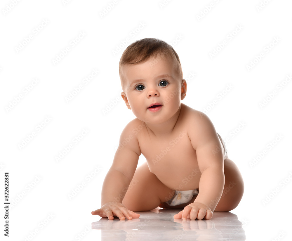 Curious Infant Baby Toddler Naked In Diaper Is Crawling On All Fours Towards Looking At Camera Stock Photo Adobe Stock